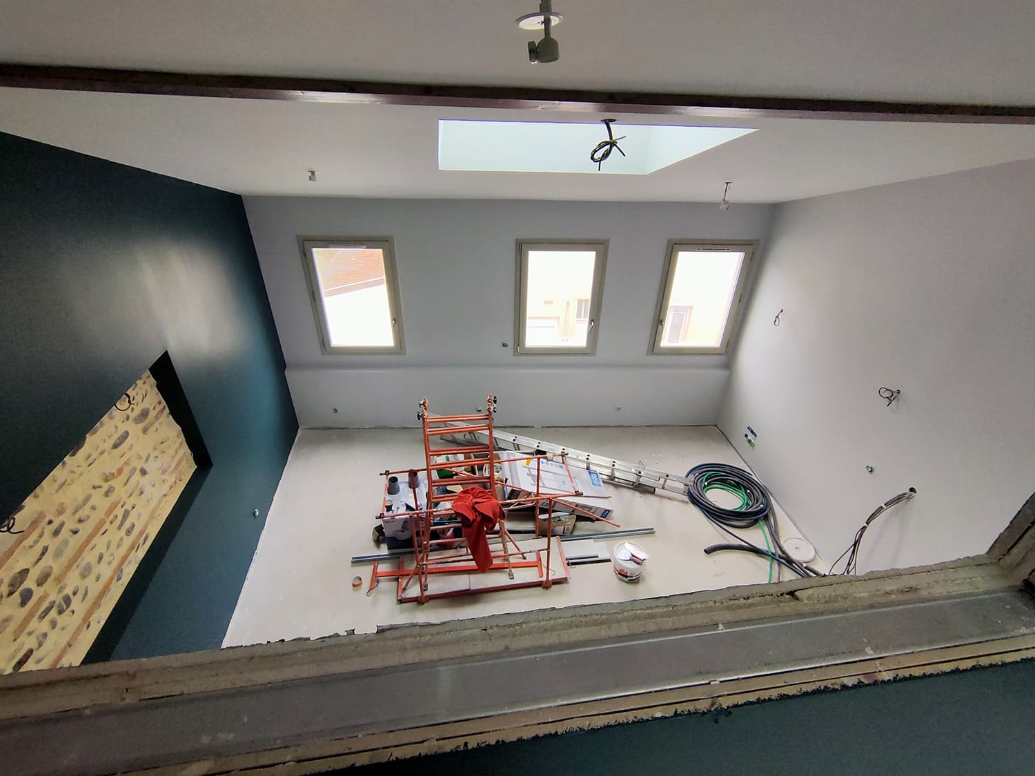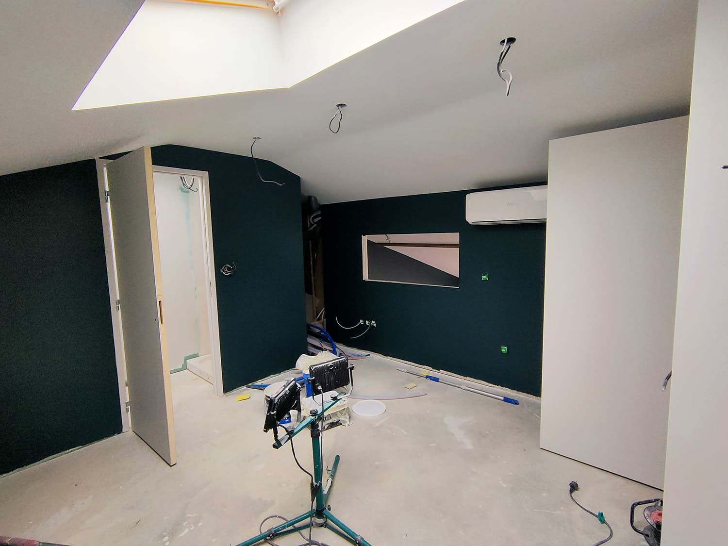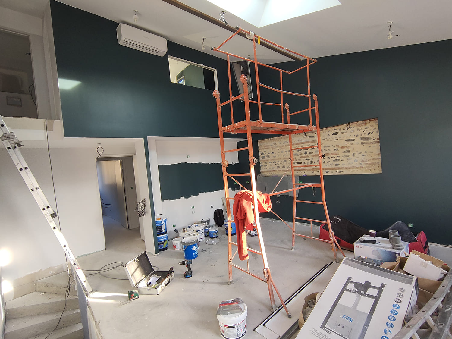 Préparation minutieuse des murs en placoplâtre : Une fois l’impression séchée, nous inspectons la surface à peindre pour identifier et combler toute imperfection ou irrégularité avec de la pâte à enduire. Après le séchage de la pâte à enduire, nous ponçons toute la surface pour obtenir une finition uniforme.