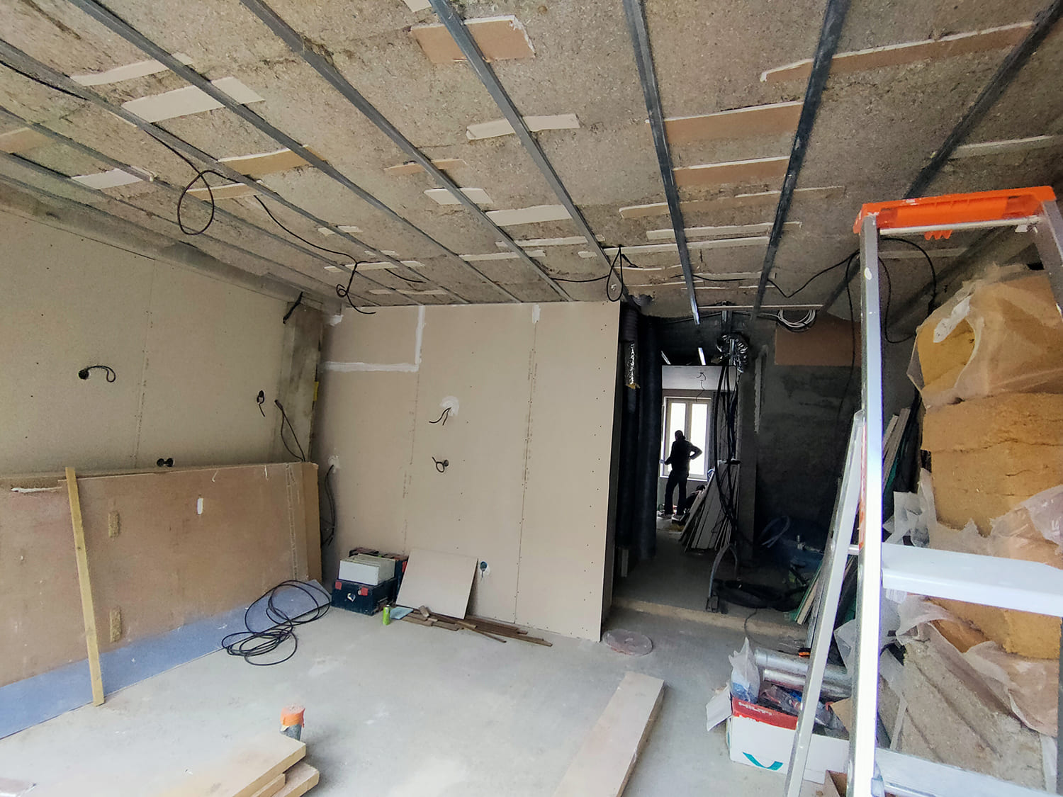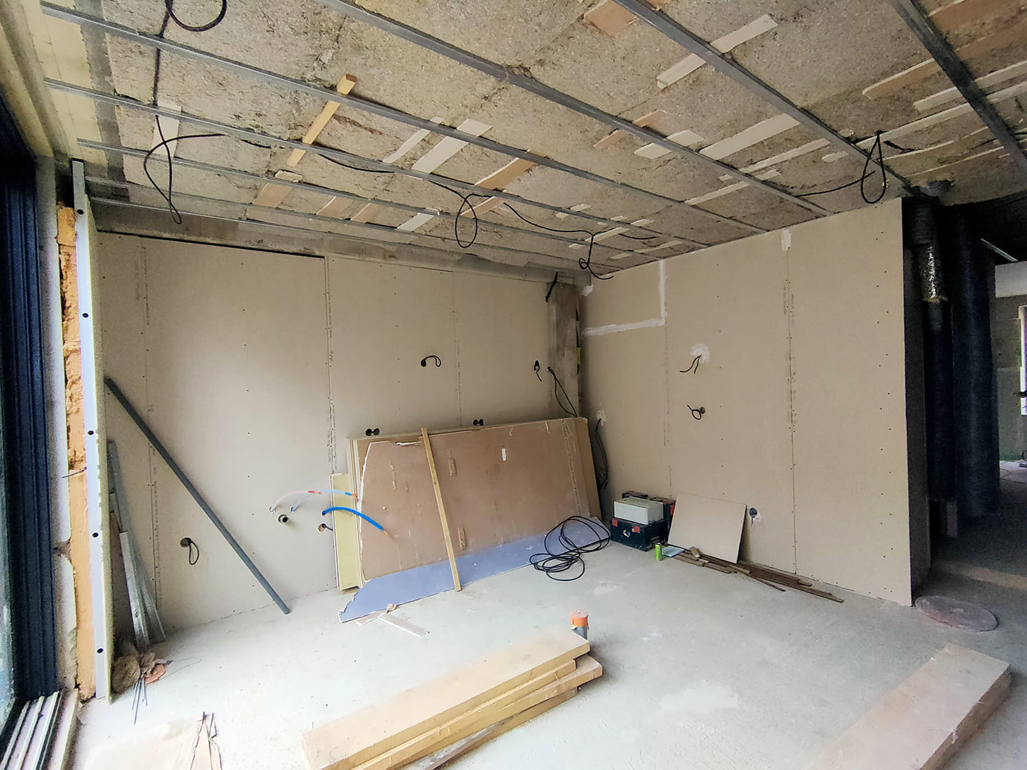 Application d’une sous-couche spécifique pour le placoplâtre : Ensuite, nous appliquons une couche d’impression pour placoplâtre sur toute la surface. Cela permet de réguler la porosité et offre une base adhésive pour la peinture finale.